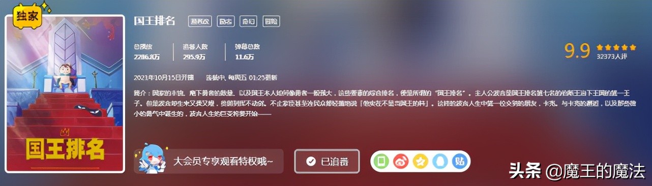 就拿b站目前新番评分中,以9.9分夺得第一的《国王排名》来说,刚刚3集播出后,就斩获近3000万的播放量,有近300万人追番,这都足以说,这部作品对于观众的吸引力可见一斑。
