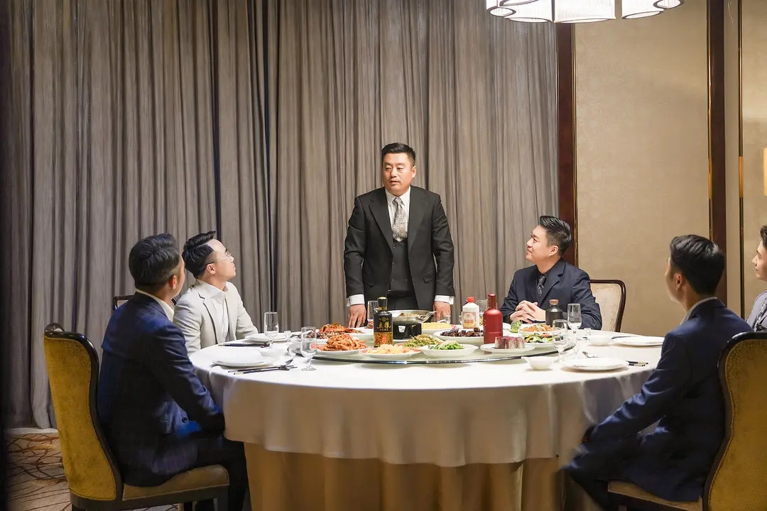 老九来到饭店,被客户们簇拥着来到主宾位,主陪、副陪分坐两边,按照当地规矩开门红,主宾开场要喝三杯酒,老九没含糊,接过来一饮而尽。