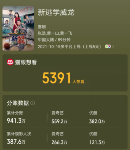 《新逃学威龙》是张浩、 黄一山 、 黄一飞 、 罗家英、 童飞主演的一部网大喜剧片,目前上线两个视频平台5天时间,分账票房941万,在网大作品中已经算是不错的存在。