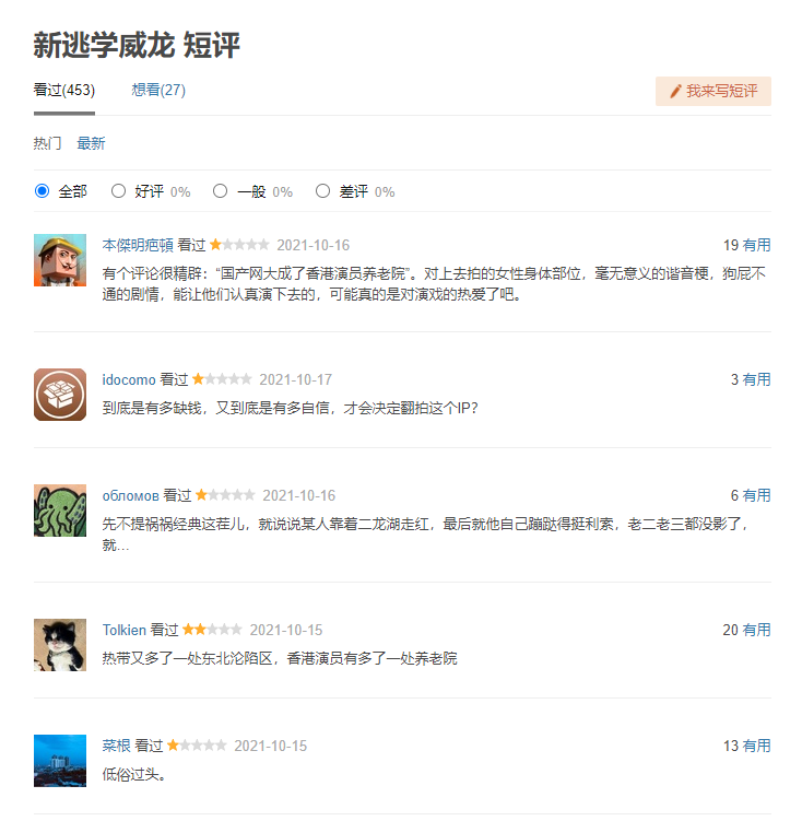 然而另外一边这部电影的口碑却不怎么样,大部分是一星差评,偶尔几个评价也是在说电影几乎就是周星驰《逃学威龙》的低俗翻版,而且是把三部《逃学威龙》拼接到一起。