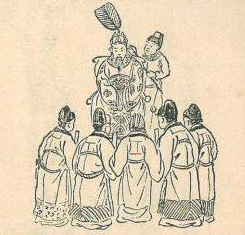 一人高坐,另一人手持扇,其余都弯腰参拜。我们现代人也不难理解,因为电视剧里经常出现这种场景,这是天子的礼仪。