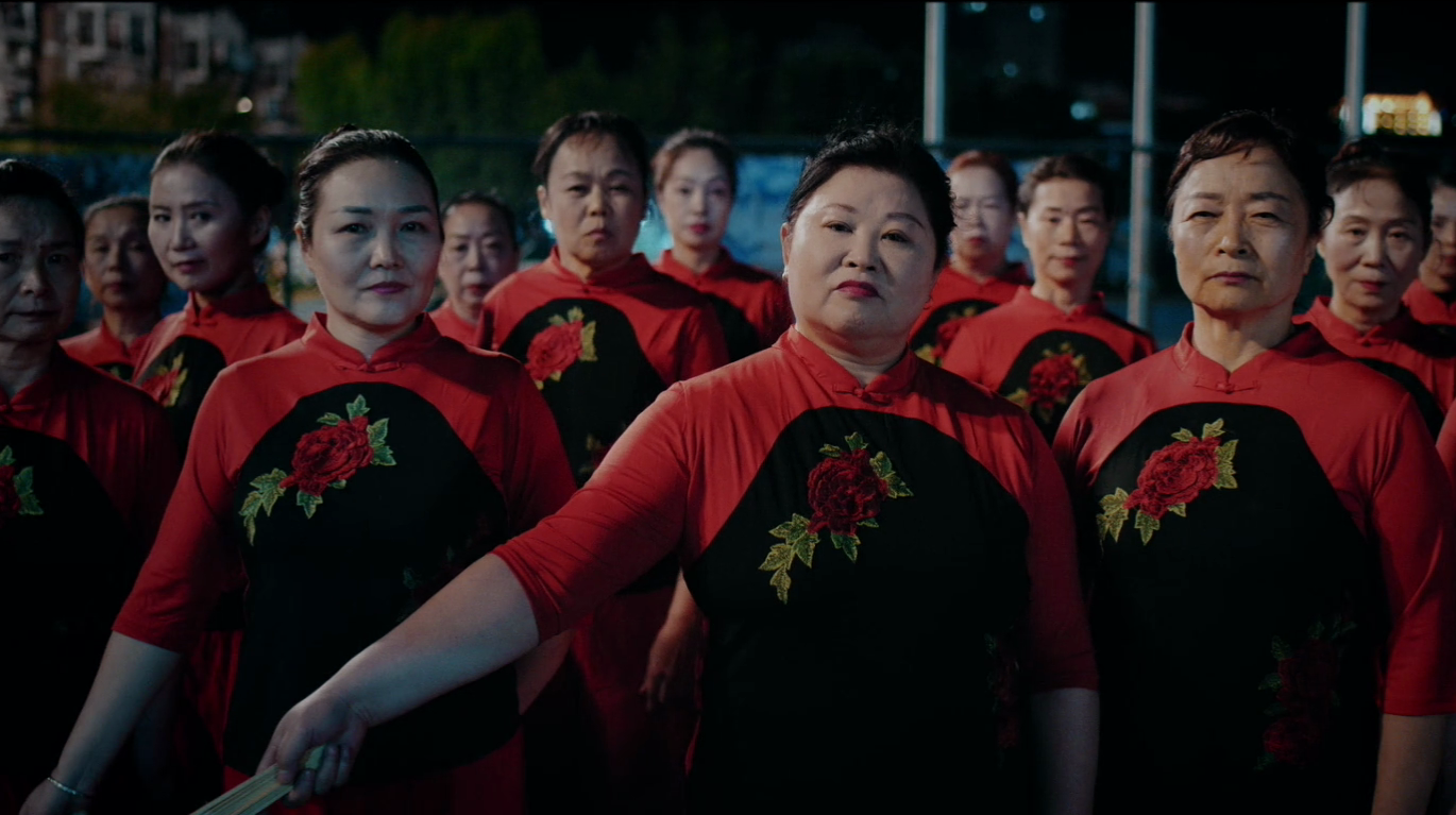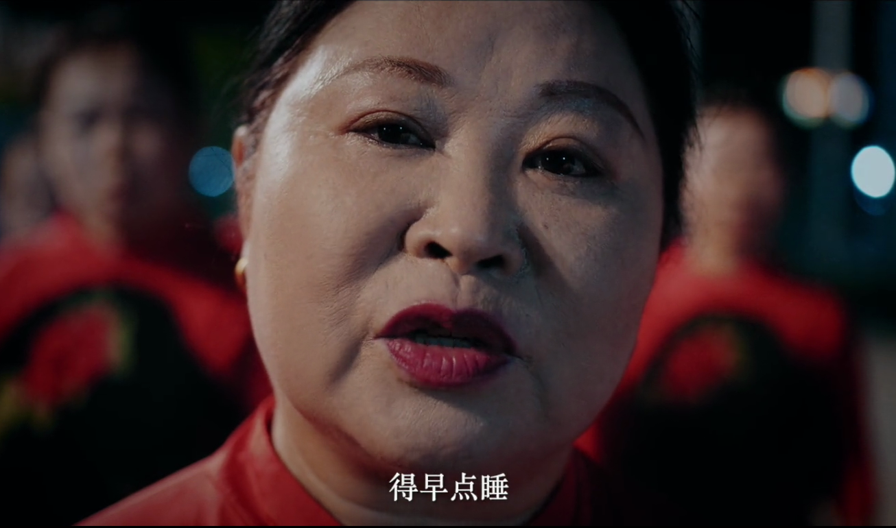 这边,全身黑红色调,当仁不让的广场舞阿姨;