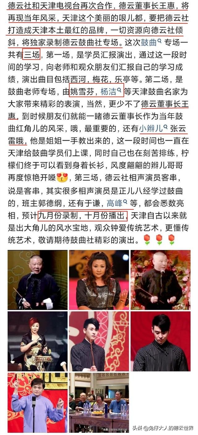 9月3日,网上有这么一则消息,德云社鼓曲社将于天津卫视合作,录制关于德云社鼓曲社的内容,而德云社董事长也将登台演出,展现当年的风采,并且要把德云社鼓曲社打造成天津本土最红的品牌。看到这这则消息,不少网友持着怀疑的态度,这是真的还是假的呢?为什么官方没有给出正面的回应呢?不过从目前的情况来看,这则消息还是比较靠谱的,要知道德云社和天津卫视的关系非常的不错,有这样的合作也是符合情理的。