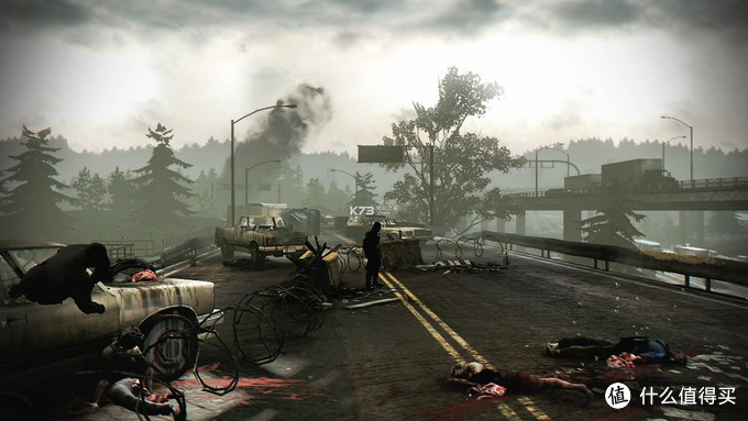 游戏画面很棒,游戏使用unreal 3.5引擎技术,简单说就是3d背景+2d人物,风格是末世那种阴暗,杂乱的风格,偶尔穿过城市阳光从画面深处发射出来给人一种病态美;游戏气氛渲染到位,穿过街道呼呼风声迎面而来,僵尸的嘶吼从远处飘来,时断时续的电台频率,燃烧的汽车和房屋无一不告诉玩家身处末世。