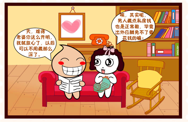 小美:唉,其实呢,男人藏点私房钱也是正常勒,毕竟出外应酬免不了要花钱的嘛! 小明:天,难得老婆你这么开明,我就放心了,以后可以不用藏那么深了。(开心状)
