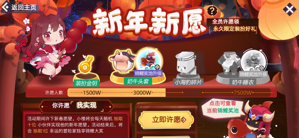 在新年新愿的活动中,大家快用看到非常良心的活动,其中就有着全员许愿领取永久限定装扮好礼的活动,只要参与许愿,大家就可以领取到装备钥匙、奶牛头套、小海豹碎片以及奶牛睡衣。不过想要拿到奶牛睡衣和锦鲤奖池升级,只能看全服的玩家给不给力了,毕竟只有全员许愿,大家才可以拿到这件可爱的装扮。