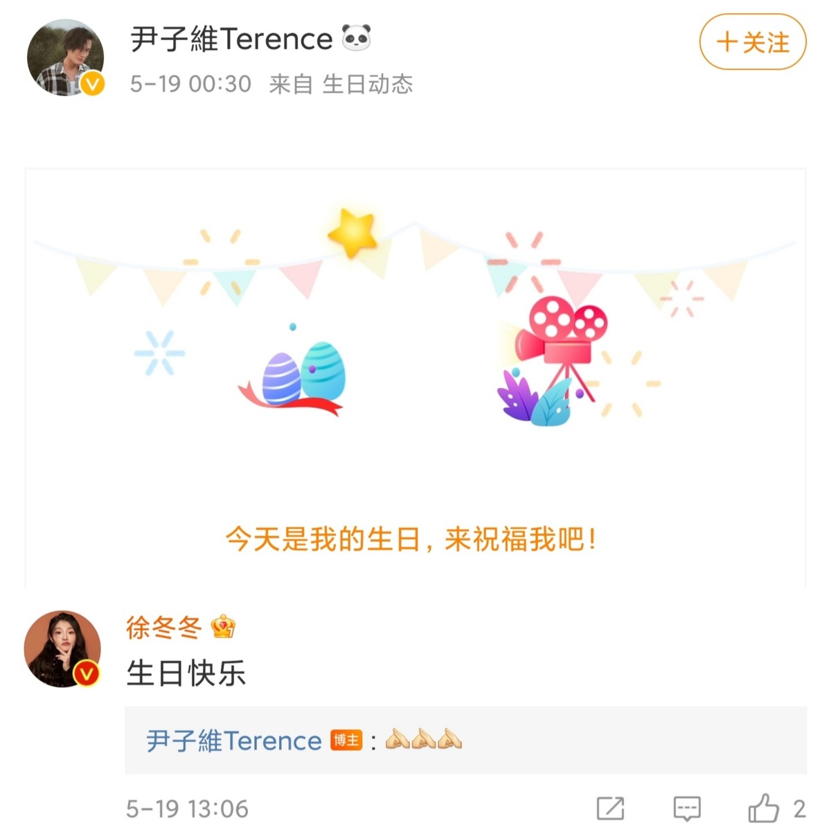 在系统发布的自动祝福状态下,徐冬冬毫不避嫌地留言祝前男友生日快乐,尹子维也回复了抱拳感谢的表情。两个人大方坦荡,就像普通朋友一样友好问候。