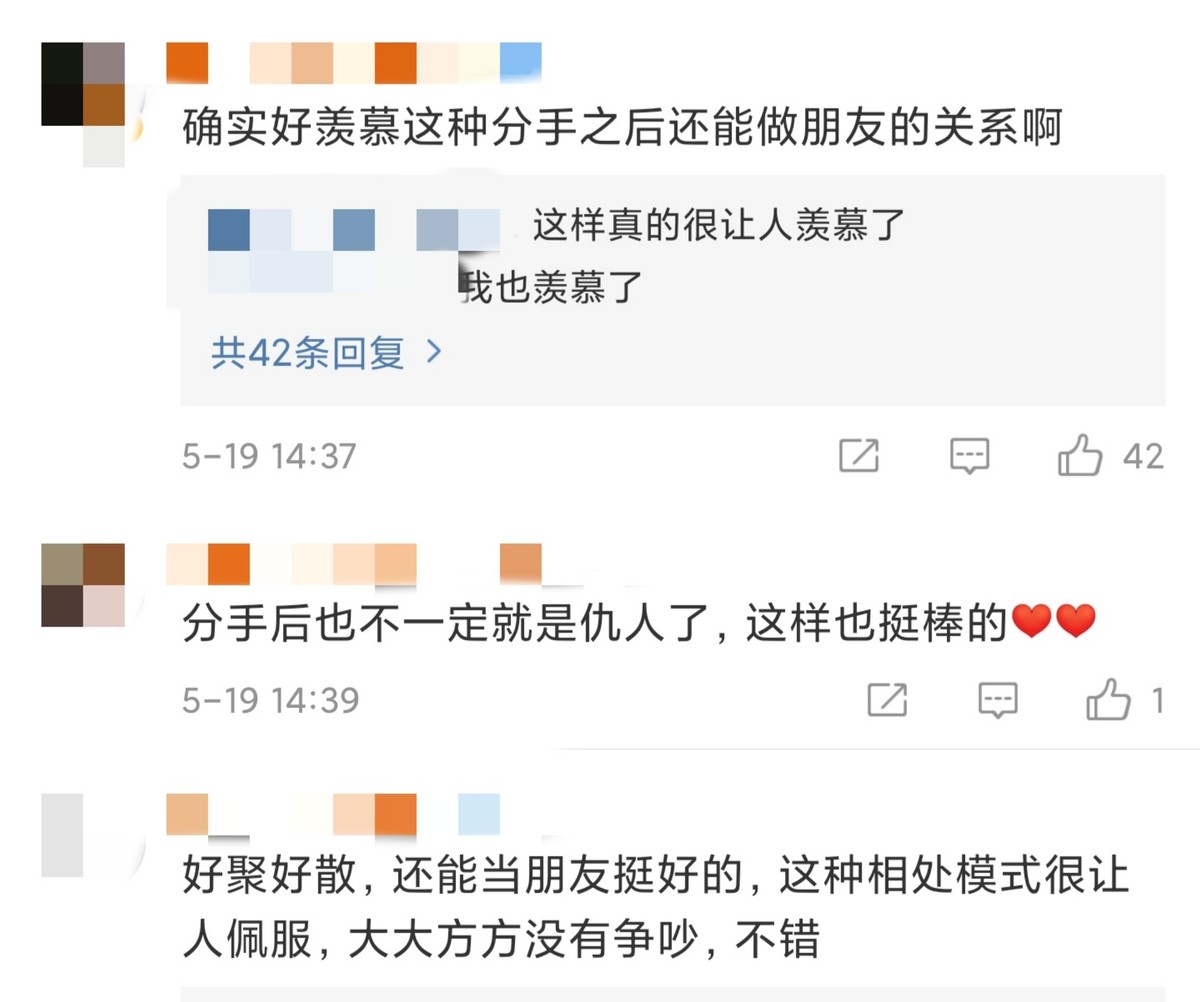 网友看到两个人的互动,纷纷留言表示羡慕。有人说好聚好散,这样大大方方地做回朋友很好。也有人说分手了不一定是仇人,这种朋友的相处方式让人很舒服。