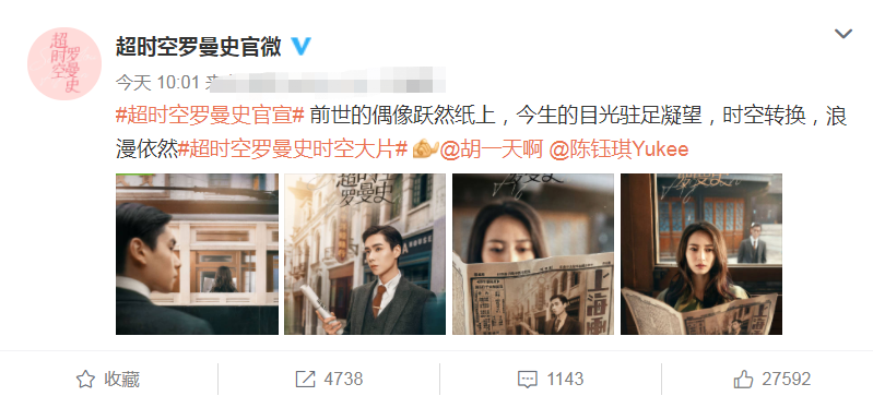 官宣开机后,近日官方微博上更新了动态,分享了两位主角胡一天和陈钰琪的时空大片,看到他们在海报上的造型就很激动了,让我们看看两位主角的颜值有多高吧。