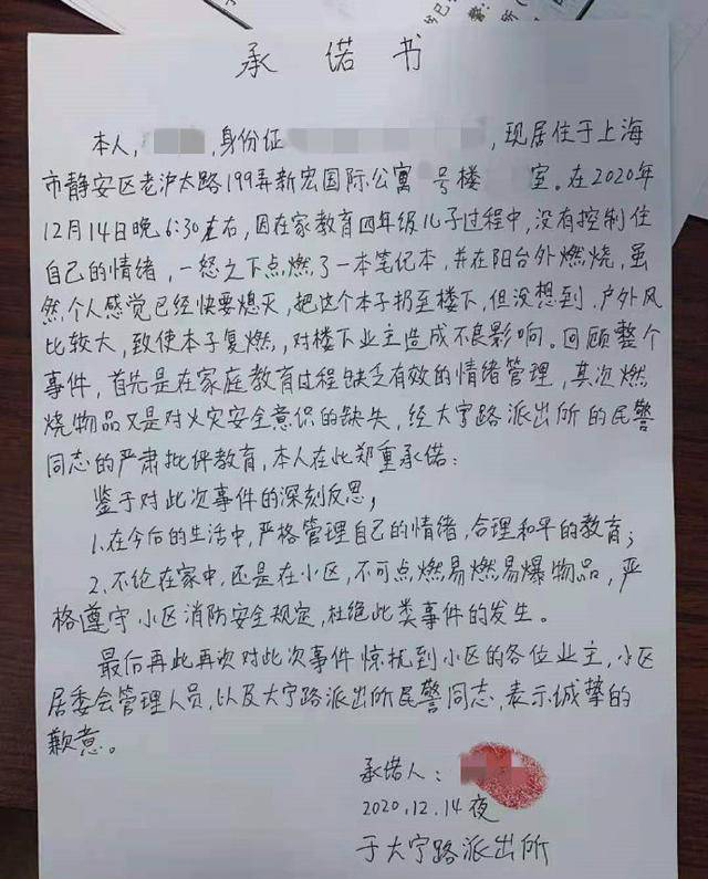 事后,民警对这位爸爸进行了严厉的批评教育。爸爸也意识到自己的行为不妥,在写下保证书后,上门向受到惊吓的居民赔礼道歉。