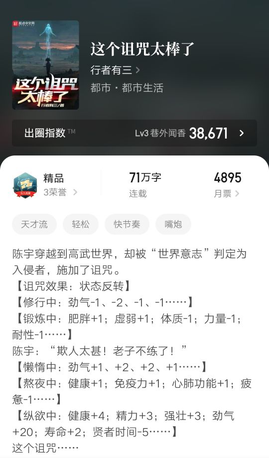 故事讲述主角穿越到平行世界高武版,被面位意识排斥,落下诅咒(金手指),一切正向增益皆转化为负向增益,一切负向增益皆转化为正向增益。