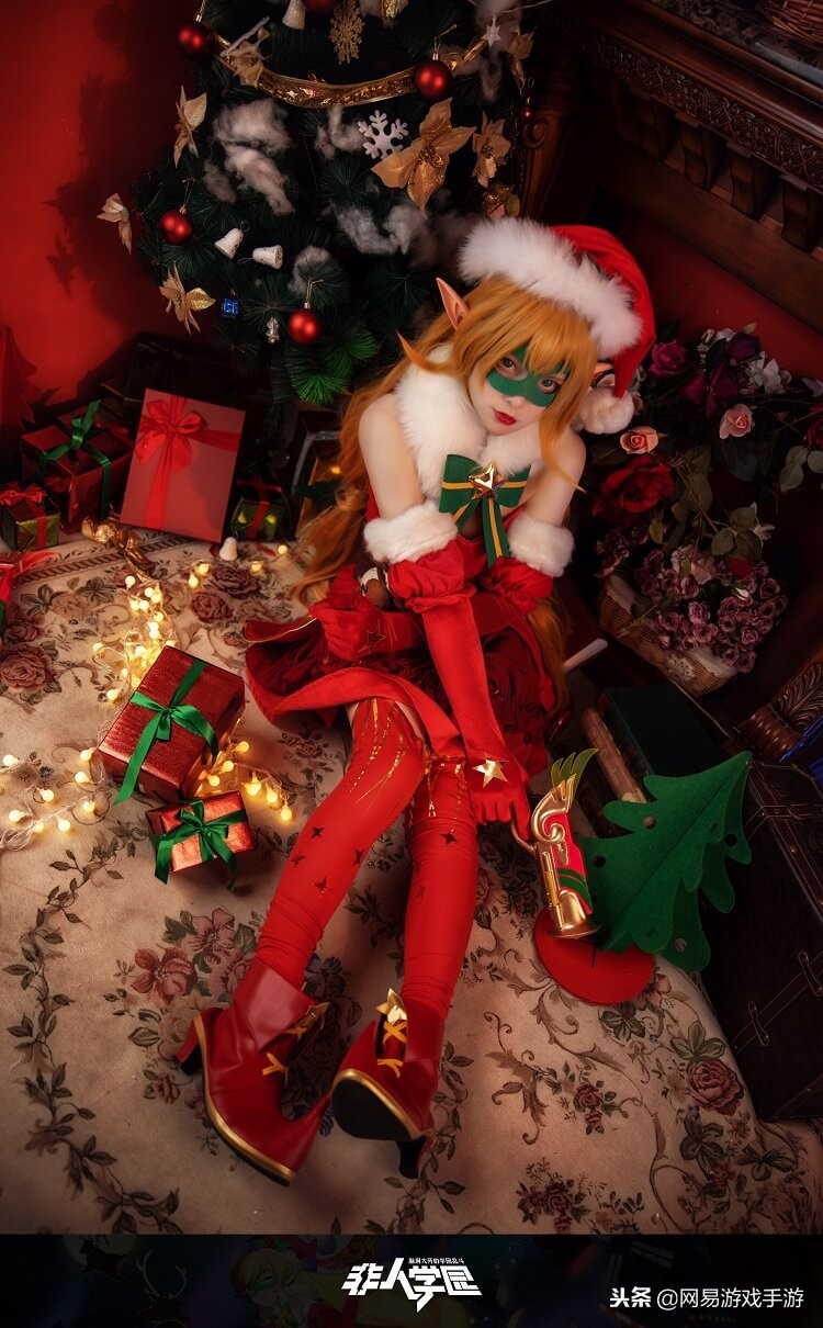 除了在学园派发惊喜福利,由知名coser你的糖分带来的白灵圣诞使者cos,还将突破次元壁,亲自给各位同学送上节日的祝福。这一组作品,以明红色贴身剪裁的短裙、华丽丽的长筒袜,衬托出了白灵修身性感的身段。