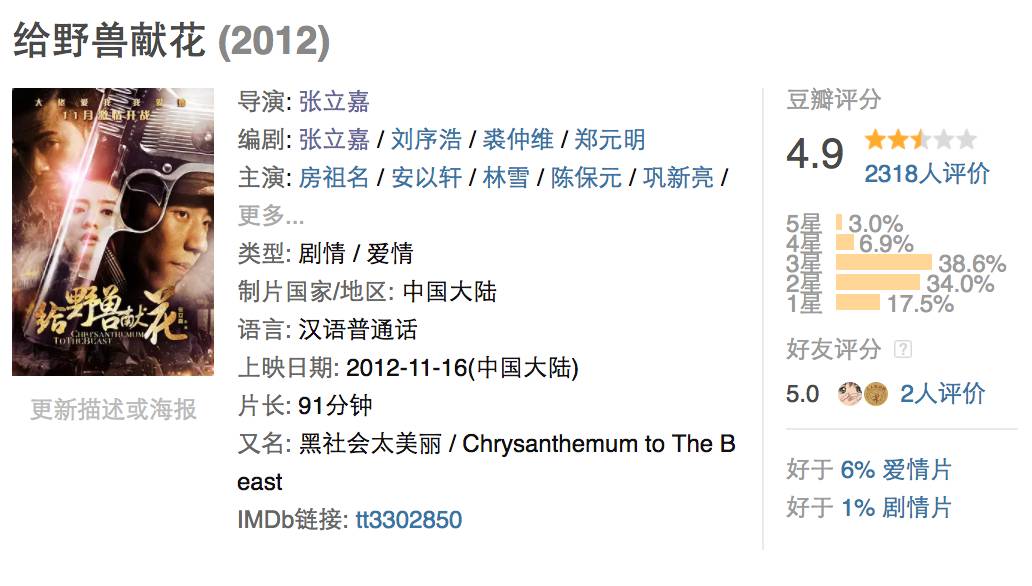 他之前只执导过一部电影:房祖名主演的《给野兽献花》。豆瓣评分4.9。