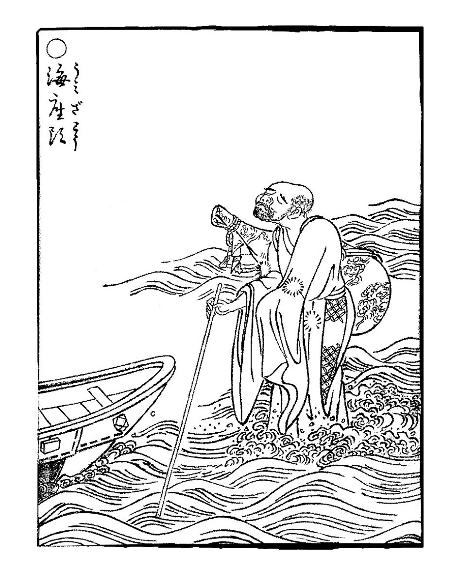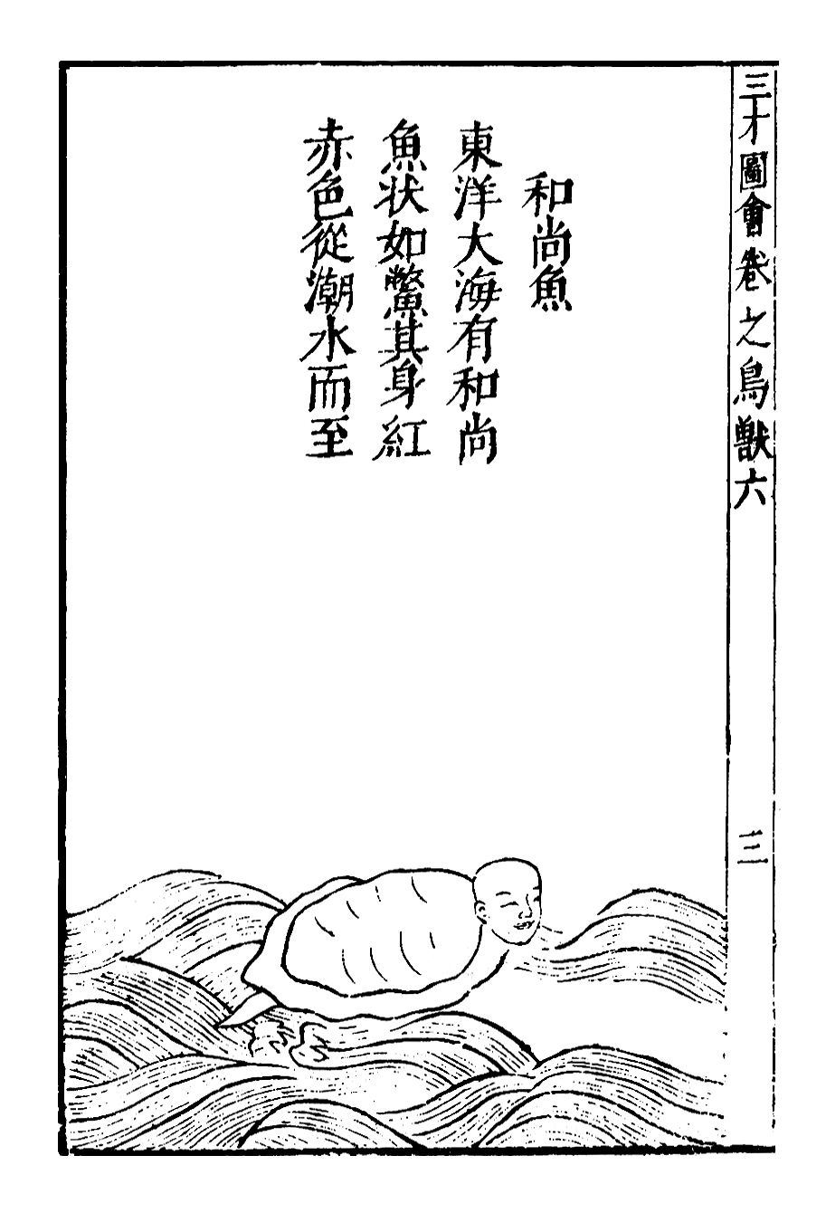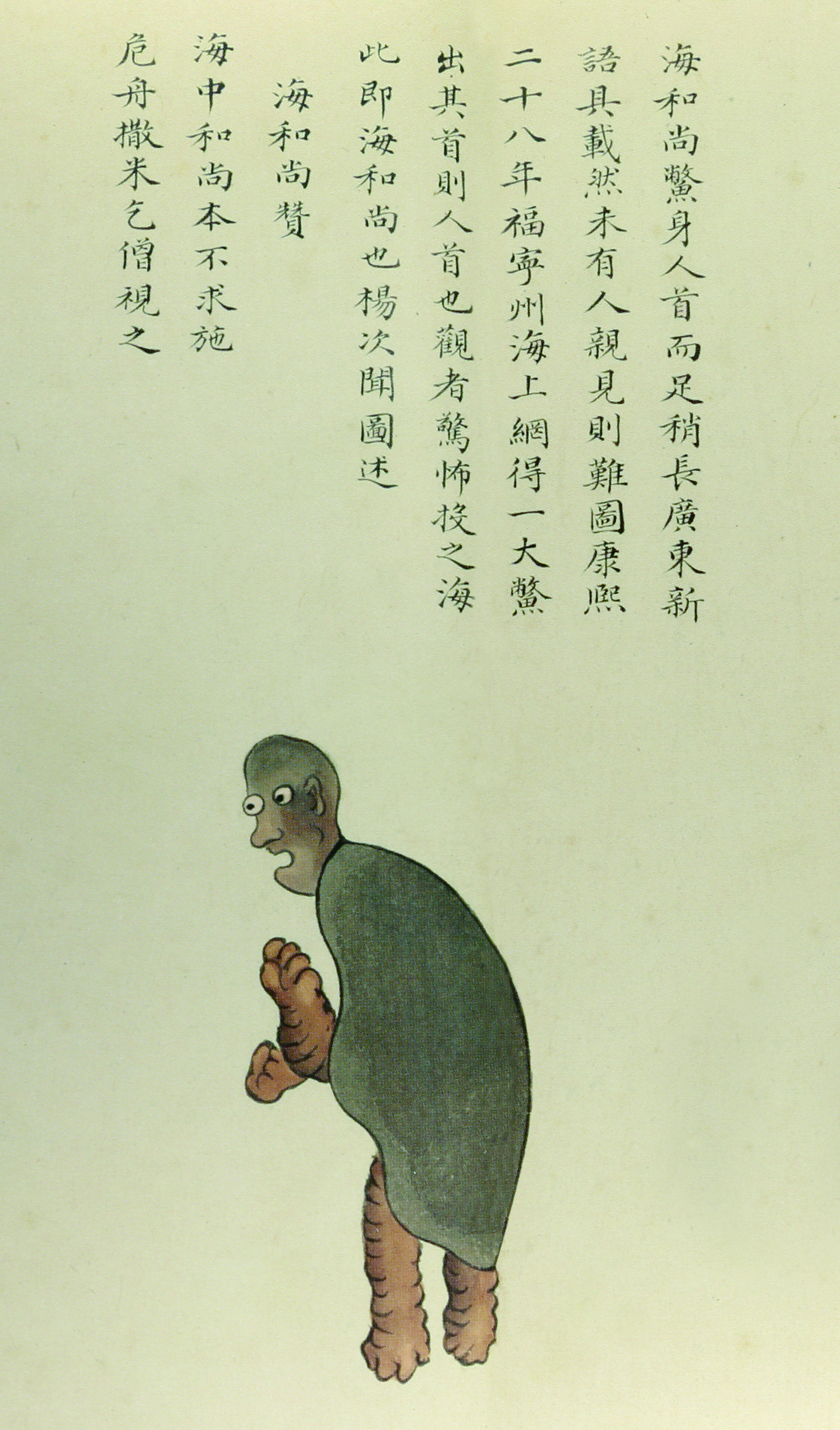 海和尚鳖身人首,而足稍长,《广东新语》具载,然未有人亲见则难图。康熙二十八年福宁州海上网得一大鳖,出其首则人首也,观者惊怖,投之海。此即海和尚也。杨次闻图述。海和尚赞:海中和尚,本不求施。危舟撒米,乞僧规之。