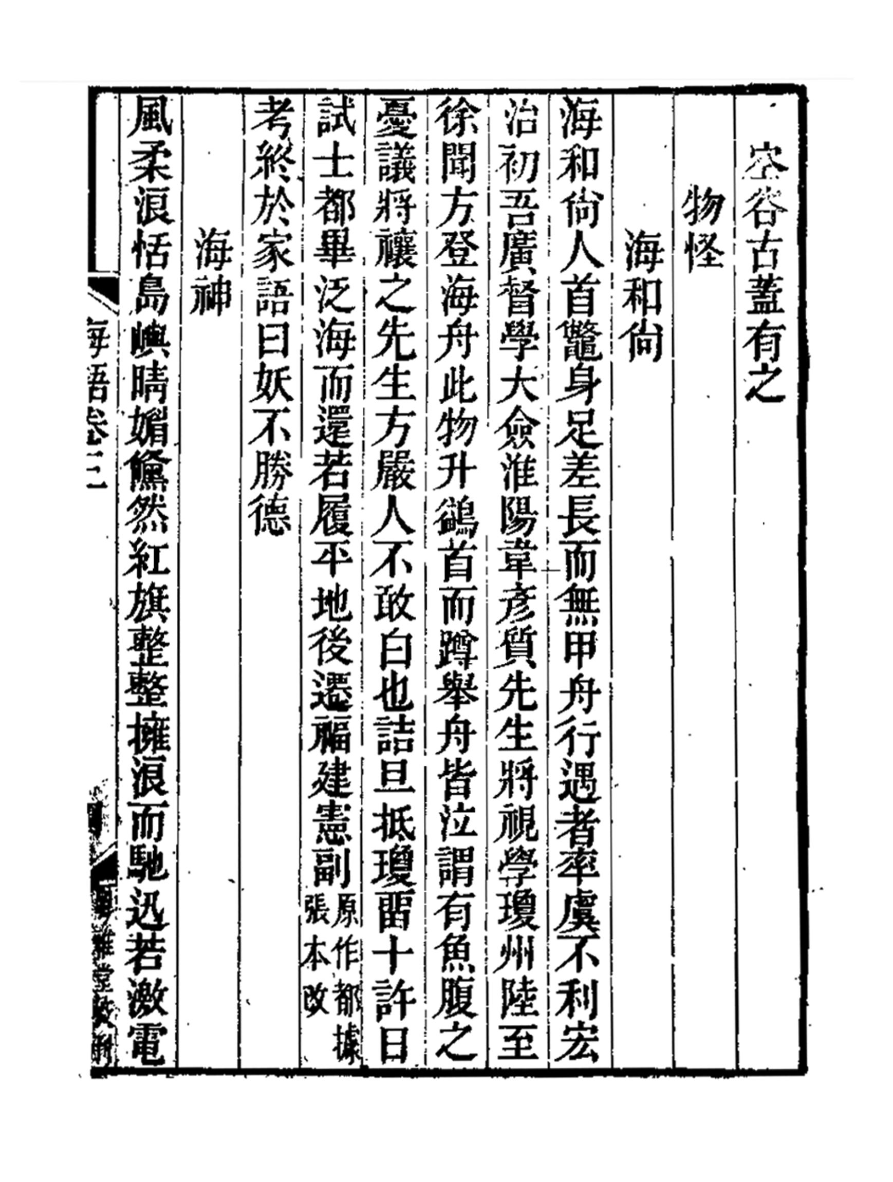 海和尚人首鳖身,足差长而无甲,舟行遇者率虞不利。宏治初,吾广督学大佥淮阳韦彦质先生将视学琼州,陆至徐闻,方登海舟,此物升鹢首而蹲,举舟皆泣,谓有鱼腹之忧……抵琼,留十许日,试士都毕,泛海而还,若履平地,后迁福建宪副,考终于家,语曰:妖不胜德。
