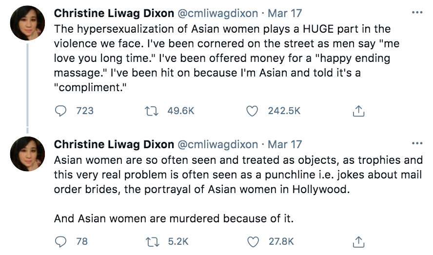 除了一些好莱坞的名人齐齐发声,许多亚裔,也在自己的社交媒体上分享对于此事件的震怒和恐惧。一位名叫christine liwag dixon的亚裔作家,在自己的推上这么写道: