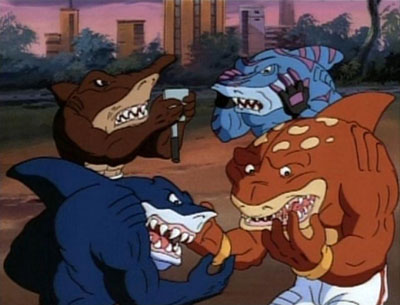双面博士企图通过基因改造技术制造变异军团,征服fission市。在一次实验中,他成功的将一只龙虾和旗鱼改造成了变异生物,但是却被bolton博士撞见。dr. bolton反对双面博士的研究,却反而成了双面博士的实验对象,被变成了怪物。为斩草除根,双面博士设计抓住了bolton的四个儿子,再他们身上注射了混有鲨鱼基因的药剂。四兄弟并没有因此而死去,反而变成了上半身是鲨鱼,下半身为人身的鲨鱼侠。鲨鱼侠拥有巨大的力量,能够在地底下自由穿行;他们的大嘴具有惊人的咬合力,可以咬断并吞食钢铁、混凝土。后面的故事,就是鲨鱼侠和双面博士的变异军团展开的系列战斗了。