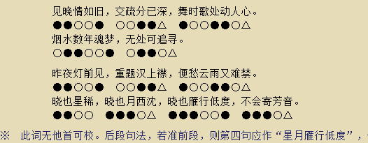 有的词牌只有一个名字,一种词体,当然也只有一个词谱,会注明”无他首可校“。这种词牌的词谱有一个明显的特点,就是没有可平可仄的地方,大家可以看看下面黄庭坚的这首《喝火令》,词谱中只有 ○和●,没有⊙和◎。