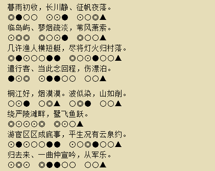 词谱中的符号各有意义, ○标平声,例如第一句暮雨初收的“初收”就是两个平声字(○○);