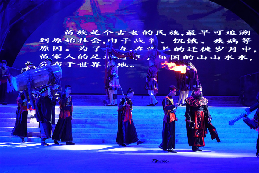 第二场《迁徙》,这一场是整部歌舞剧中最深沉厚重和艰辛的部分,描写了苗族从诞生、迁徙、图腾崇拜、定居和繁衍生活的一部壮丽史诗。苗族人自称是蚩尤的后代,早在五千多年前生活在黄河流域,因败于炎帝、黄帝的联军,大部分苗族先民被迫开始第一次大迁徙,放弃黄河中下游地区而退回到长江中下游平原,并于洞庭湖和鄱阳湖之滨建立了"三苗国",经过历史上多次大规模的迁徙,来到了贵州,一直生活至今。