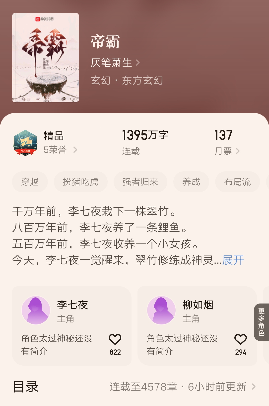 李七夜则还是在找羊的路上,厌笔萧生让《帝霸》一遍遍地重复之前的套路,劝退了一大批读者。小说何时完结目前是个未知数。我个人大概看了四五百万字,就对前面的九界之类的地方印象深刻一些。后续好久没看,不知道写到哪了。