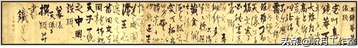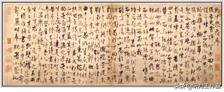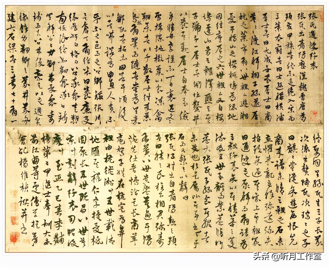 杨维桢《张氏通波阡表》长卷,章草,至正25年(1365)书。横145.3厘米,纵28.9厘米,东京国立博物馆藏。晚年草书的代表作品。作品带有十分浓重的章草《急就章》笔意,生辣奇古,耐人寻味。