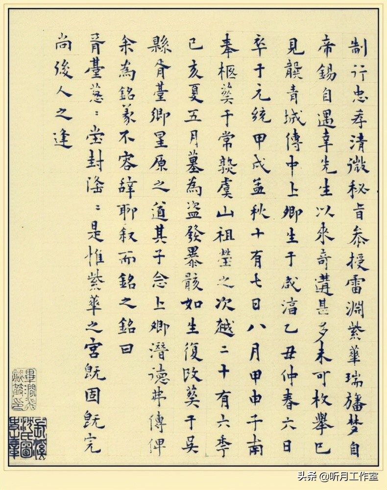 这是至正十九年(1359)杨维桢应友人周上卿之请所撰写的墓志铭文。所撰行文简洁生动富于性情,充分显示了杨氏出色的文学才华。文字小楷书为摹勒上石之底本,但见用笔稳健劲险,结体端严精准。值得称道的是,通篇因笔致挺健多用挑笔,而愈显气息连贯满幅生机。
