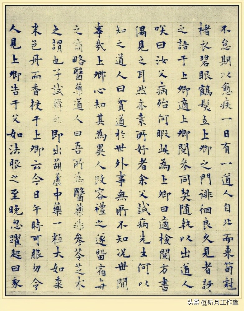 释文:己酉春正月十三,夜梦群女御什伍。冉冉自绛云西来迎余,至一所,见宫殿盘郁,西之轩名紫极馆。问其竟曰:海棠城也,少选城主者,服云罗袌,戴金星冠,带流金之铃。从者执节.出迓曰:余友食钩子来也邪?人间文口业填巳尽,虖未延升馆,诸侍设醴作乐,席终,命一姝出胡麻飰一器,劝餐云:此于四十年前,在台所啖未尽余粮也,自兹十九年后当至此,昔余主子其识之时,余谢别以诗二绝。主者复命一姝出银光纸索书,诗曰:夜骑箕尾到西清。紫府仙官有我名。莫羡夫容城主好,芙蓉不似海棠城。二女溪颐客断魂,鹃声愁杀阮郎魂(昏)。海棠城廓君须记,飰熟胡麻第二番。
