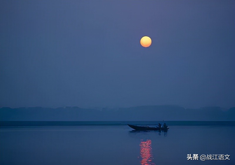 这面大圆镜愈往上升便愈缩小,红色也愈淡,不久它到了半天,就成了一轮皓月。这时上面有无际的青天,下面有无涯的碧海,我们这小小的孤舟真可以比作沧海的一粟。不消说,悬挂在天空的月轮月月依然,年年如此。而我们这些旅客,在这海上却只是暂时的过客罢了。