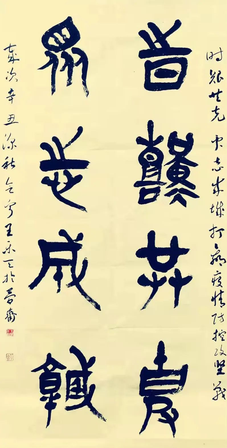 释文:新冠疫天冰雪寒,党心民心固若磐。众志成城驱魔瘴,不教瘟君入汉关。