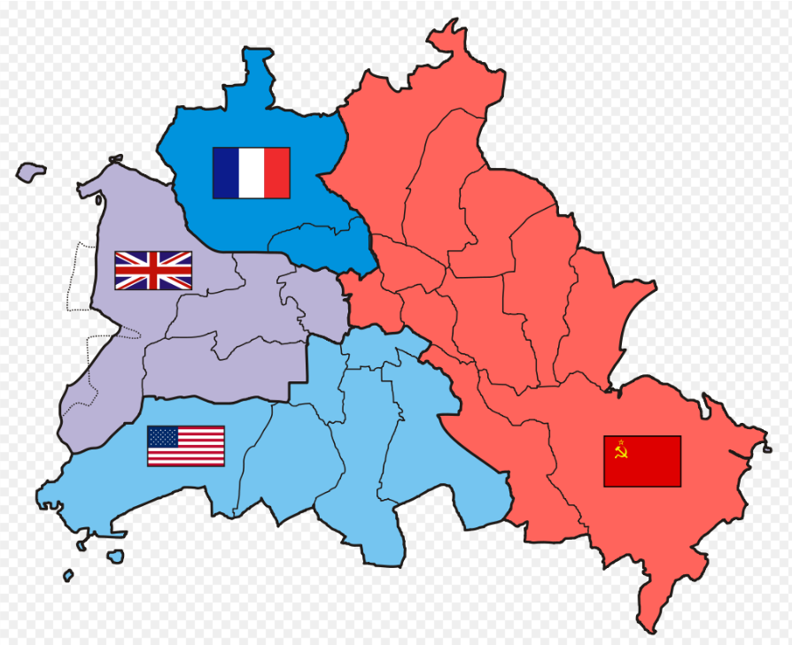 二战结束以后,德国首都柏林由美国、苏联、英国和法国分区占领。其中英美法占领区为西柏林,被包围在东德境内,成为西德的一块飞地。