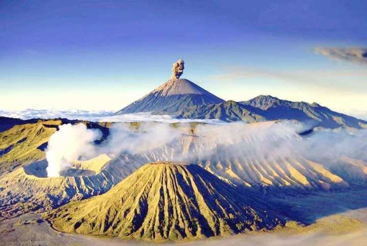 塞梅鲁火山位于印度尼西亚爪哇岛东南部,海拔高度3676米,是爪哇岛上最高的山峰,这是一座知名的活火山,资料记载从1818年至今,它已经发生过55次强度2-3级的喷发现象,实际上它3600多米的高度也正是由一次又一次的火山喷发的熔岩和火山灰垒起来的,也形成了它圆锥形的巨大山体,由于它的高度本来就已经很高,所以喷出去的火山灰烟柱也就更高了,有飞行器测量发现烟柱顶端已高达12公里,如此之高的高度在火山喷发中也并不常见。