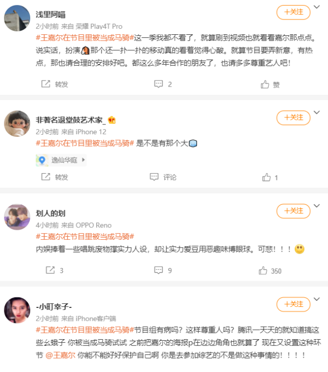 也有路人说,其实这些都是王嘉尔自愿的,他看到这个头套的时候,马上就说自己来当马,一点犹豫都没有,不是被人逼去的,所以只是节目效果,粉丝们何必这么上纲上线,其实这个观点是不对的,看到王嘉尔这样,粉丝们是非常心痛,如果节目组没有设置这么为难人,就不会有王嘉尔主动请缨的环节了,无非就是想靠艺人的这些行为来赚取热度和收视率,资本都是这样的。