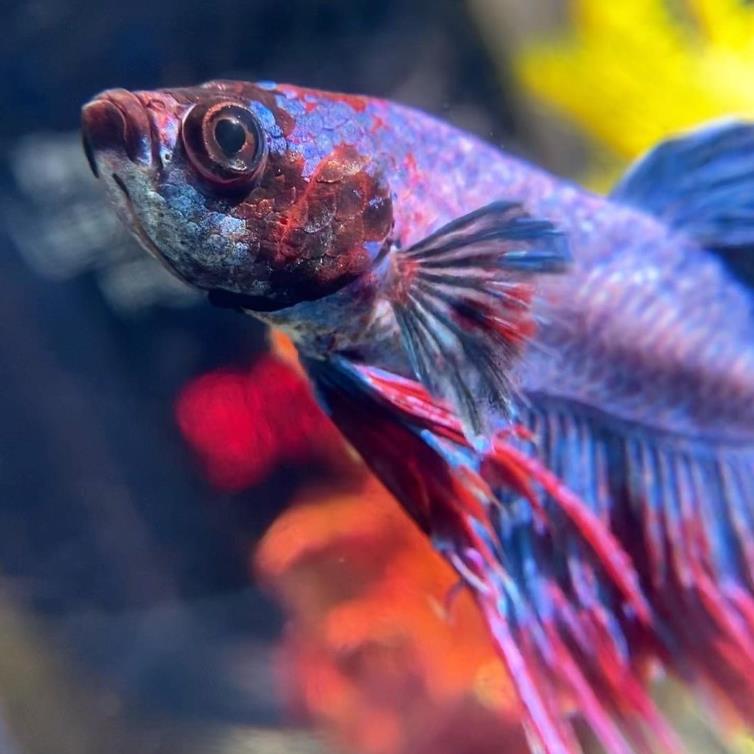有深蓝色的鱼鳞,紫红相间的尾巴,和灵动的浅蓝色鱼鳍。