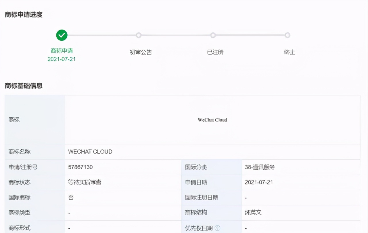 随后,就有人扒出微信在前两个月的时候,刚刚注册了一个「wechat cloud」的商标,正在等待实质审查。