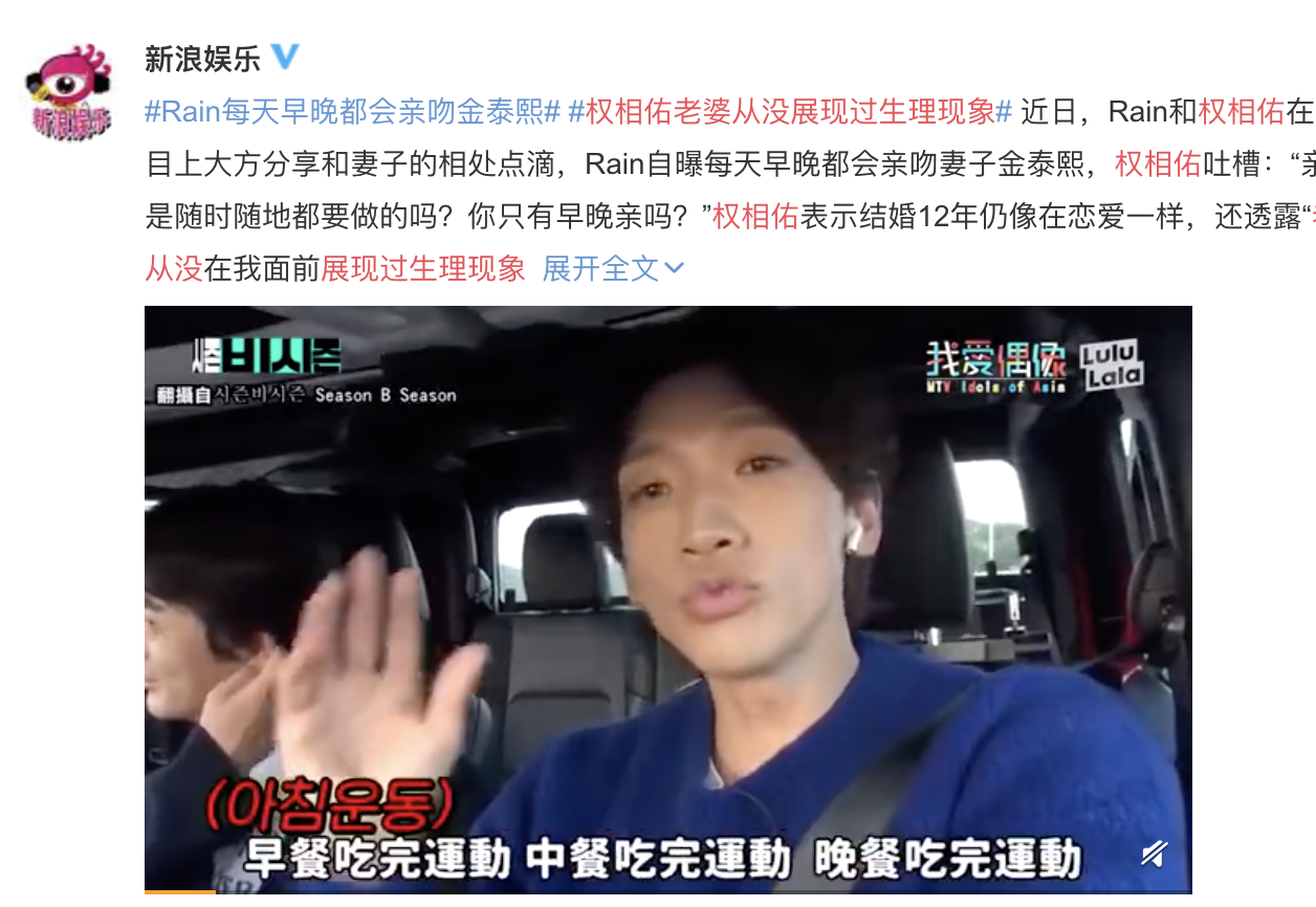 近日,韩国明星rain和权相佑在节目上大方分享和妻子的相处点滴,权相佑表示结婚12年仍像在恋爱一样,还透露“老婆从没在我面前展现过生理现象,没闻到过味道,也没听到过”。