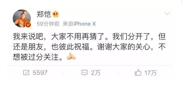 然而没想到官宣两年之后,两个人突然传出了分手的消息,并且得到了郑恺的承认。