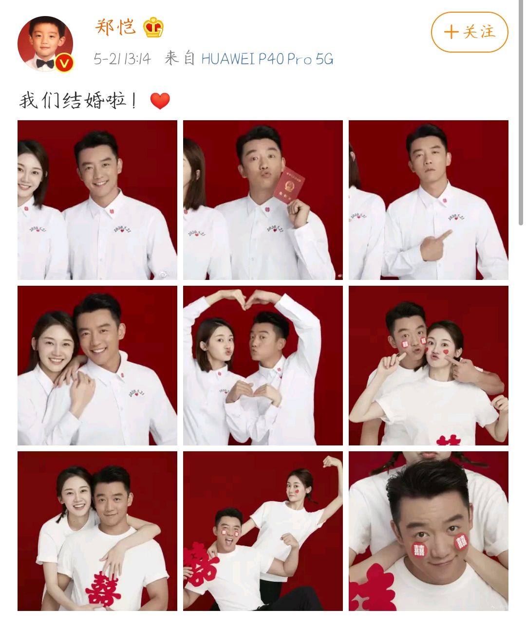 5月21日,郑恺在社交平台宣布了和苗苗结婚的消息,晒出了两个人的结婚照,两个人穿着印有"2020,5,21"的数字的白衬衫,对着镜头搞怪,看起来十分甜蜜。