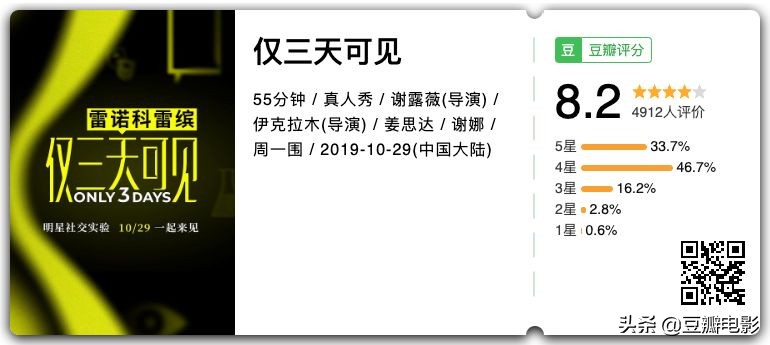 豆瓣上,《仅三天可见》也被评出了8.2的高分,对于一档国产真人秀来说算是不俗的成绩。