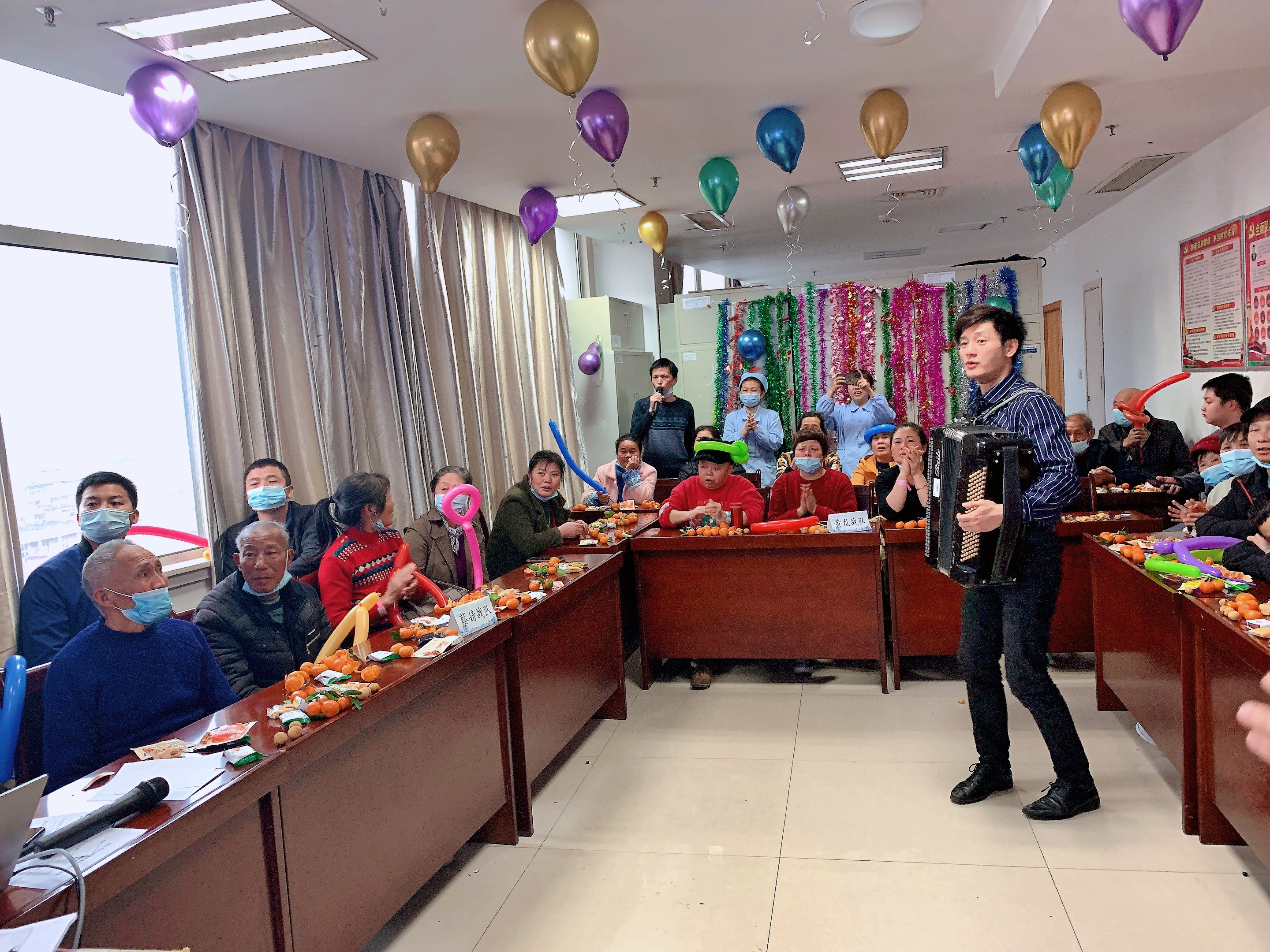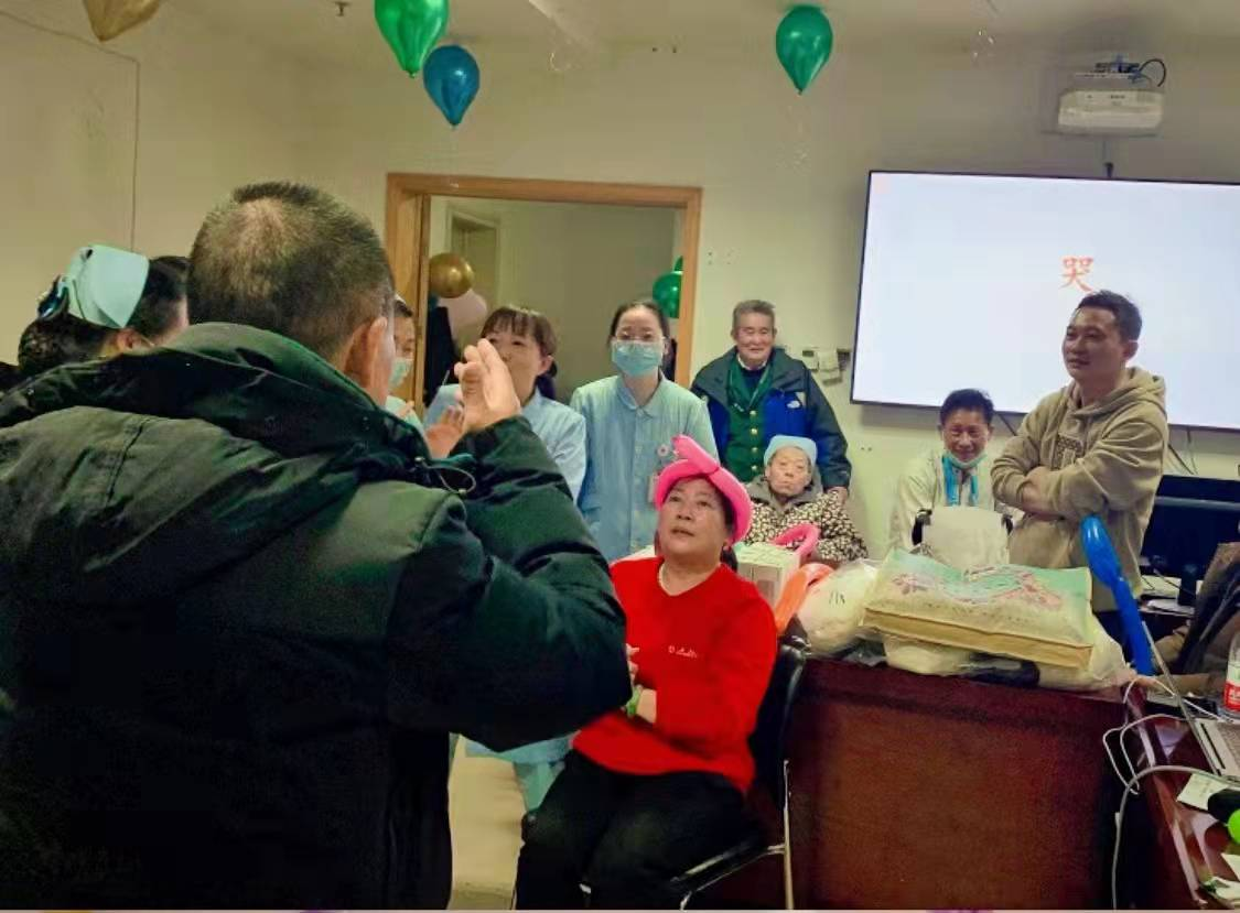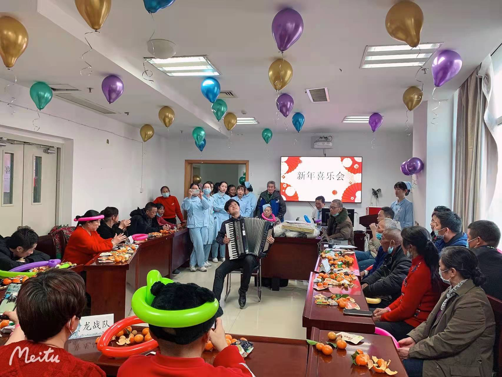 随着梅孟雪护士长一句“大家下午好”,喜乐会正式拉开帷幕。开场邀请了公益手风琴演奏家黄志远教授,他为大家带来《春节序曲》和铁道游击队主题曲《弹起我心爱的土琵琶》手风琴演奏,琴声时而如小桥流水人家般细腻温婉,时而如轰隆隆铿锵有力的老式火车悠远深长声。
