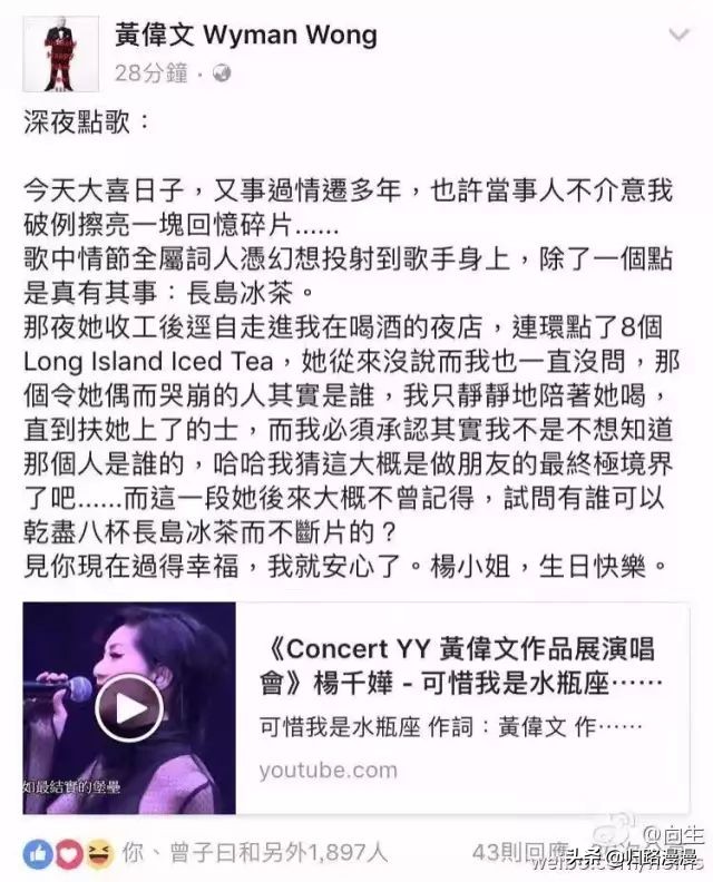 很多年后杨千嬅的生日,作为最佳损友的黄伟文,用平淡的口吻揭露了当年情里动魄惊心的细节:《可惜我是水瓶座》里的那句“拿来长岛冰茶换我半晚安睡”,根本就是杨千嬅的个人经历,而那个让她痛饮八杯还忘不掉的人,基本可以确定就是郑中基。