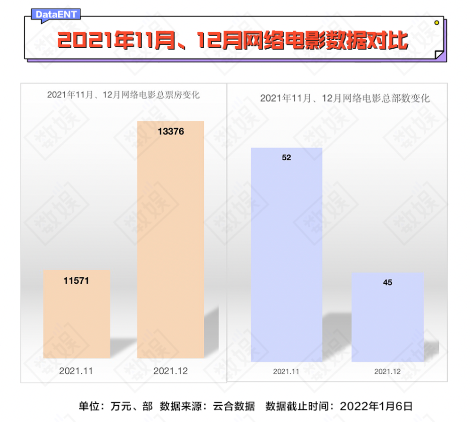 据云合数据统计,共有45部网络电影在2021年12月上线。截至1月6日,这45部影片共收获了1.34亿元的分账票房。与2021年11月相比,上线数量减少了7部,总票房却提高了1805万元,环比11月提升15.6%。