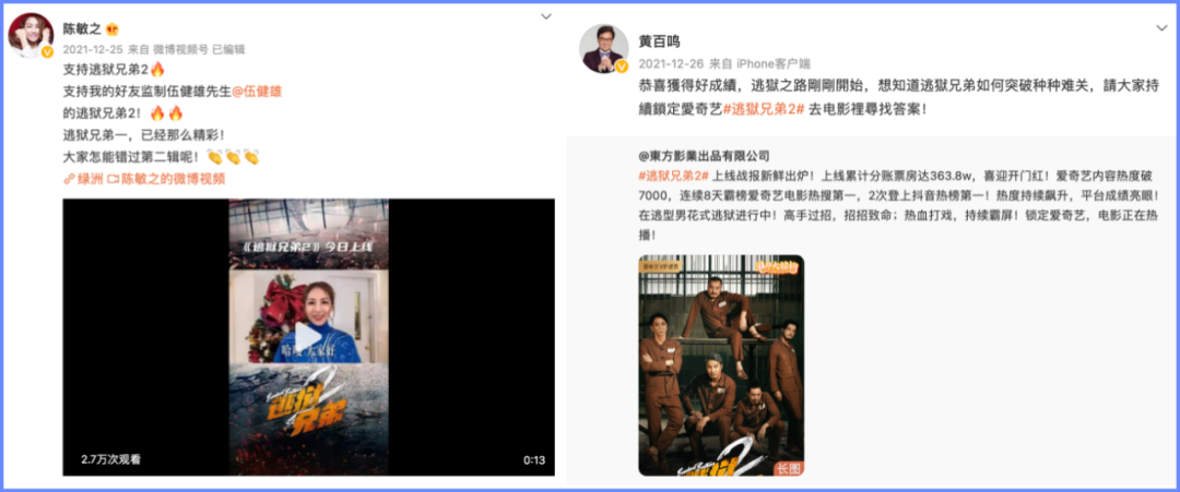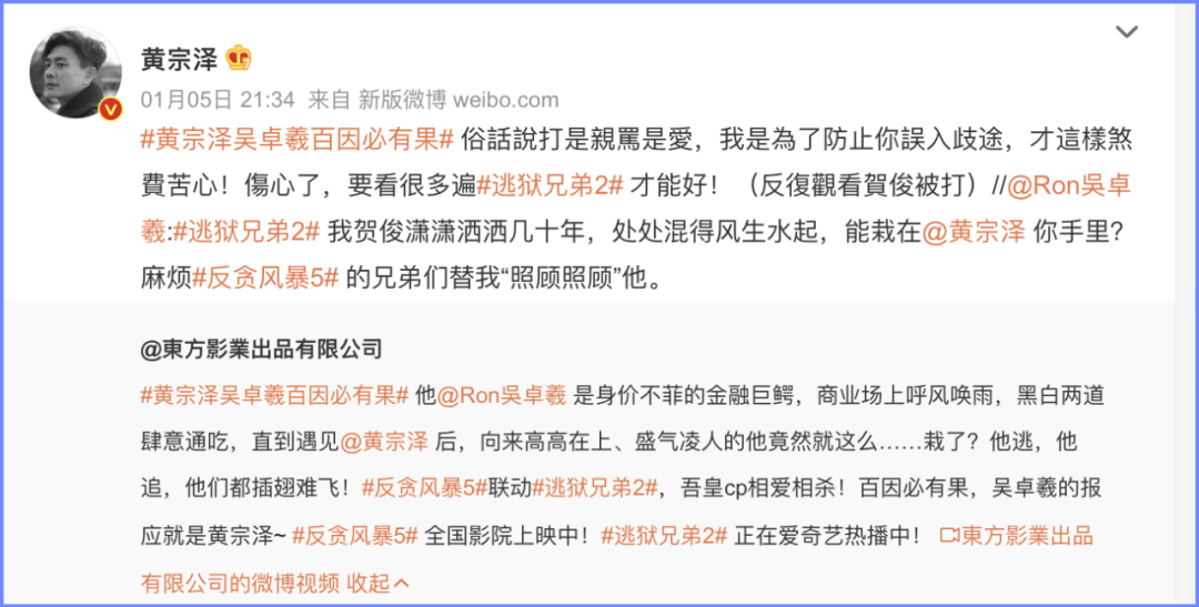 两位曾经的tvb男神梦幻联动背后,实则是他们为各自参演作品的一次宣传布局——上映于21年12月31的院线电影《反贪风暴5》和上线于12月24日的网络电影《逃狱兄弟2》。