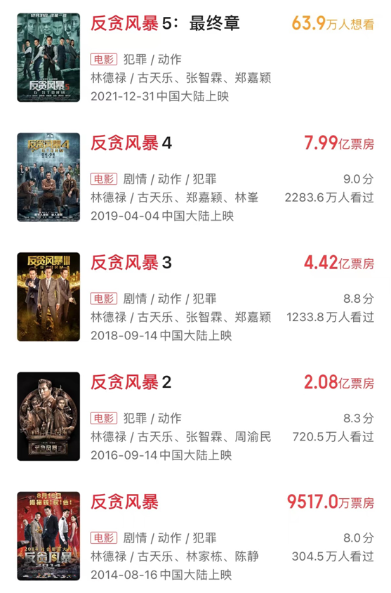 《反贪风暴》系列电影,积累了非常不错的口碑和粉丝基础,前四部影片票房持续走高,《反贪风暴5:最终章》猫眼“想看人数”更是高达64万人,不仅位居近期最受期待榜top1,更成为华语动作犯罪影史想看第一,预测票房将超过10亿,2021年贺岁档预定爆款,《反贪风暴5:最终章》当之无愧。