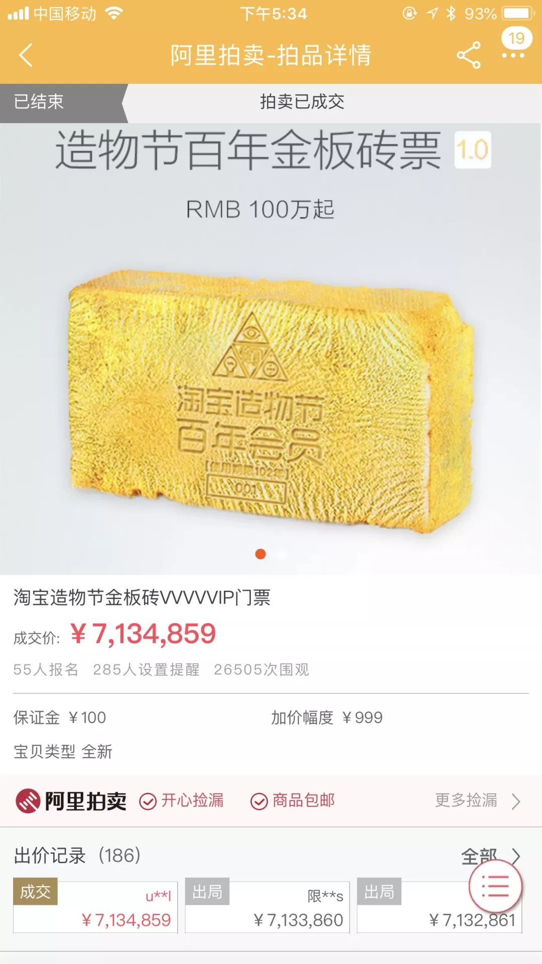截至下午3点22分47秒,这块金砖终于达成了成交,共55人参与,出价186次,成交价7134859元。