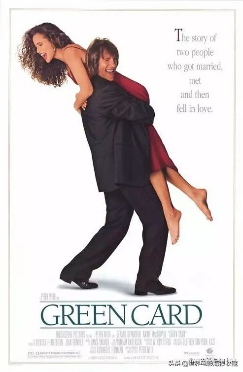 彼得·威尔执导,安迪·麦克道威尔、杰拉尔·德帕迪约(大鼻子情圣)主演,爱情喜剧,讲述假结婚骗绿卡的故事,该片也是杰拉尔·德帕迪约进军好莱坞的第一部影片,并为其赢得了 第48届金球奖电影类-音乐喜剧类最佳男主角。我对这部影片印象比较深刻,印象中这部影片应该是cctv6刚成立时播过的影片,其预告片当时被反复播放。其影片插曲 i'll make love to you 相当值得一听。