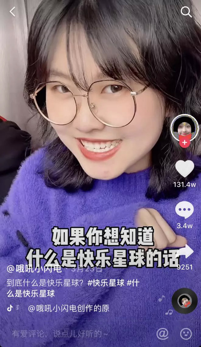 快乐星球ip的洗脑歌的发端者是抖音达人“哦吼小闪电”,她第一个将这首歌改编成短视频发布在抖音平台。