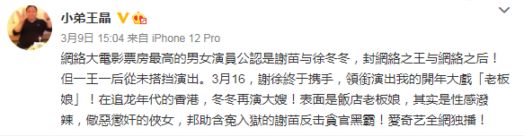 值得一提的是,近年来王晶为力捧徐冬冬,已推出了数部以她为女主的网大电影,但反响均非常一般。