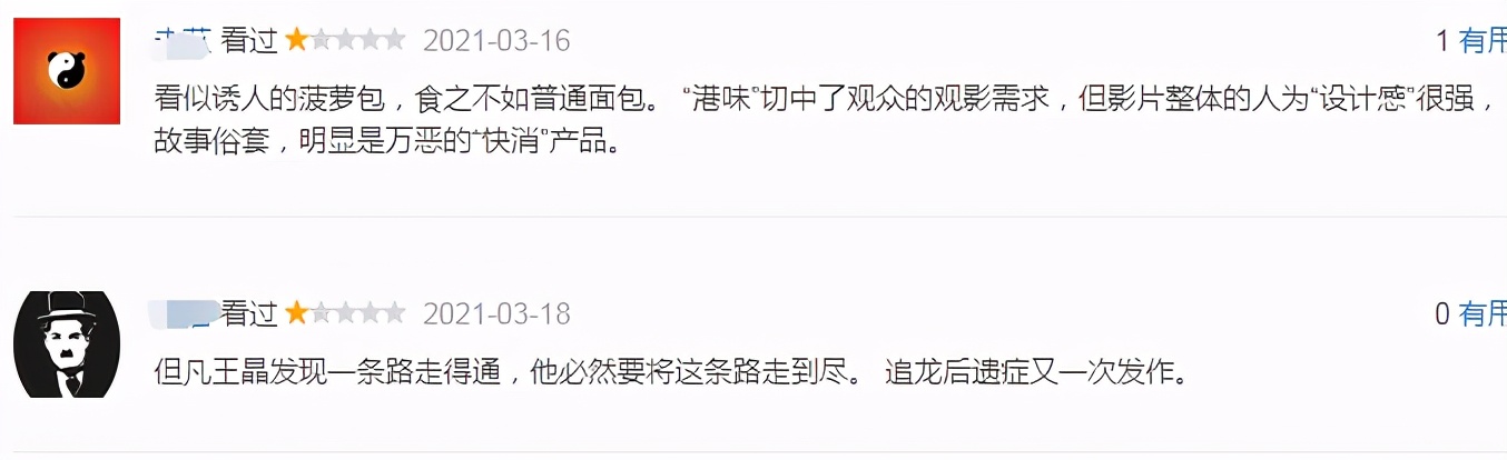 王晶在片中塞入各种老港片元素,还塞入谢苗的动作片童星情怀,甚至还塞入自己的老招数,但在豆瓣一众差评下,王晶的算盘再一次失灵了,口碑极为危险,短评区都快被一星评价给填满了。
