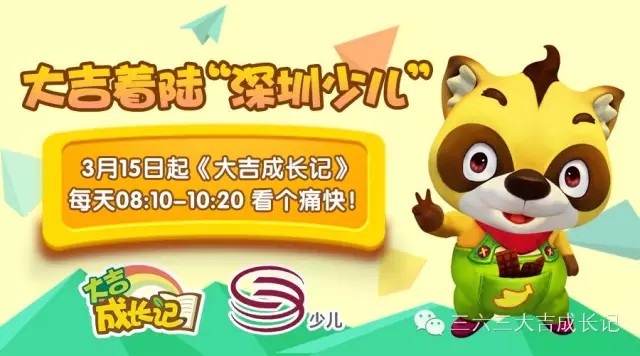 嗨,各位小朋友们,好看又好玩,还能学习安全小知识的《大吉成长记》3月15日开始,每天上午8:10-10:20分在深圳卫视少儿频道《动画连连看》剧场播出啦,大吉每天陪你一起成长哦。